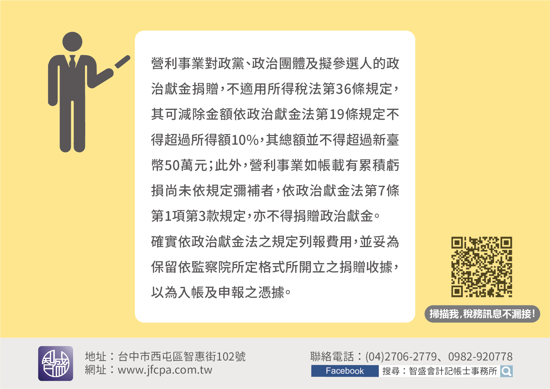 營利事業對政黨、政治團體及擬參選人的政治獻金捐贈,不適用所得稅法第36條規定,其可減除金額依政治獻金法第19條規定不得超過所得額10%,其總額並不得超過新臺幣50萬元;此外,營利事業如帳載有累積虧損尚未依規定彌補者,依政治獻金法第7條第1項第3款規定,亦不得捐贈政治獻金;至於累積虧損的認定,係以營利事業前一年度之財務報表為準,也就是說,營利事業前一年度財務報表有尚未彌補之累積虧損,本年度就不得捐贈政治獻金。