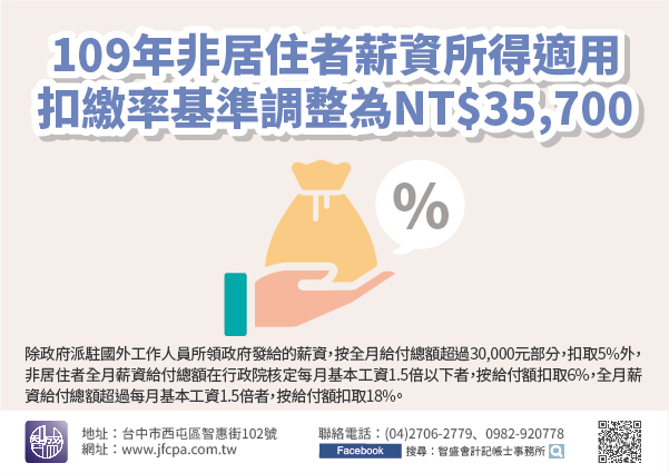 行政院勞動部於108年8月19日發布自109年1月1日起,每月基本工資調整為新臺幣(下同)23,800元。扣繳義務人給付非我國境內居住之個人(簡稱非居住者)薪資所得時,計算適用扣繳率的金額基準亦隨之調整。