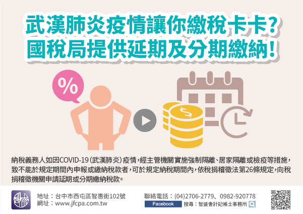 納稅義務人如因COVID-19(武漢肺炎)疫情,經主管機關實施強制隔離、居家隔離或檢疫等措施,致不能於規定期間內申報或繳納稅款者,可於規定納稅期間內,依稅捐稽徵法第26條規定,向稅捐稽徵機關申請延期或分期繳納稅款。