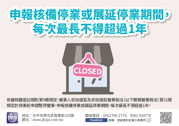 依據稅籍登記規則第9條規定,營業人依加值型及非加值型營業稅法(以下簡稱營業稅法)第31條規定於停業前申請暫停營業,申報核備停業或展延停業期間,每次最長不得超過1年,故無論是申請停業或展延停業者,停業期間最長皆為1年;該局提醒營業人,如有停業事實而未依規定申請暫停營業者,依營業稅法第46條第1款規定,除通知限期改正或補辦外,處新臺幣1,500元以上15,000元以下之罰鍰,屆期仍未改正或補辦者,得按次處罰,營業人如有停業或展延停業者,請務必於停業前依規定辦理暫停營業之申請,以免受罰。