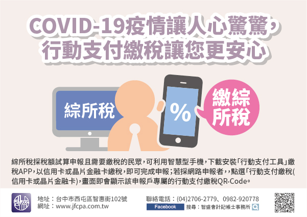 報稅季節即將來臨,眼看著嚴重特殊傳染性肺炎(COVID-19)疫情尚無消退跡象,不免讓人感到心驚驚的,此時利用「行動支付工具」繳稅,就是最佳的選擇。