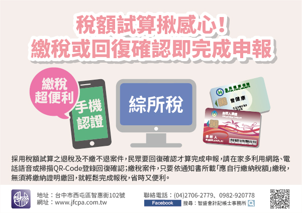 為便利民眾報繳108年度綜合所得稅,針對符合稅額試算服務的納稅義務人,國稅局自109年4月28日起陸續以掛號寄發稅額試算通知書及相關書表,或以「郵簡」通知納稅義務人自行以自然人憑證、電子憑證、已申辦健保卡網路服務註冊之健康卡或臺灣行動身分識別(TW FidO),至「財政部電子申報繳稅服務網站」(https://tax.nat.gov.tw )下載稅額試算書表,請注意查收信箱郵件。