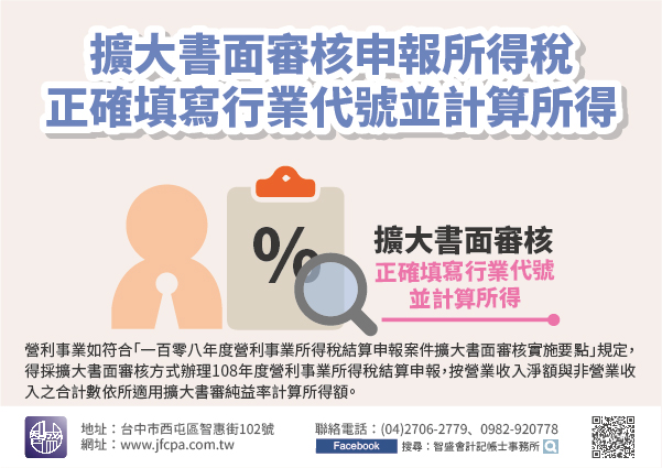 營利事業採擴大書面審核方式申報108年度營利事業所得稅,應正確填報行業代號並依所適用之擴大書審純益率計算所得額。
