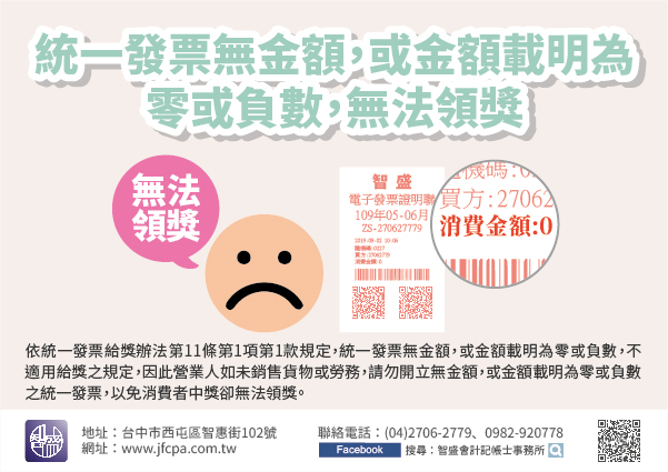 為避免造成對領獎爭議,請營業人勿開立無金額,或金額載明為零或負數之統一發票。