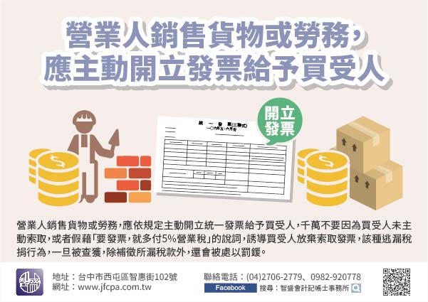 營業人銷售貨物或勞務,應依規定主動開立統一發票給予買受人,千萬不要因為買受人未主動索取,或者假藉「要發票,就多付5%營業稅」的說詞,誘導買受人放棄索取發票,該種逃漏稅捐行為,一旦被查獲,除補徵所漏稅款外,還會被處以罰鍰。