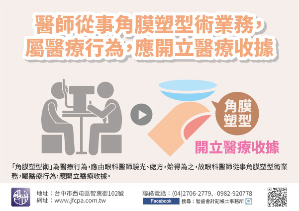 實務上,有部分人士藉由配戴角膜塑型片以達到降低近視度數之目的,因須由專科醫師經過詳細的檢查,配合配戴者眼球屈光度、角膜弧度及大小等因素評估,與一般配戴眼鏡鏡片有別,且依行政院衛生署90年1月30日衛署醫字第0890035299號函釋,公告「角膜塑型術」為醫療行為,應由眼科醫師驗光、處方,始得為之,故眼科醫師從事角膜塑型術業務,屬醫療行為,應開立醫療收據。