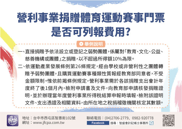 日前接獲營利事業來電詢問,營利事業購買國內體育賽事門票捐贈予弱勢團體,是否可列報費用?