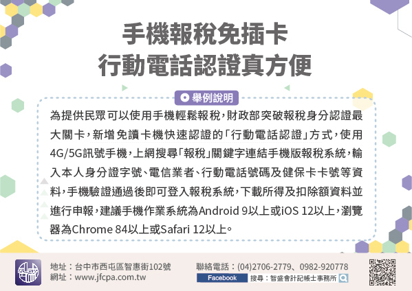 為提供民眾可以使用手機輕鬆報稅,財政部突破報稅身分認證最大關卡,新增免讀卡機快速認證的「行動電話認證」方式,使用4G/5G訊號手機,上網搜尋「報稅」關鍵字連結手機版報稅系統,輸入本人身分證字號、電信業者、行動電話號碼及健保卡卡號等資料,手機驗證通過後即可登入報稅系統,下載所得及扣除額資料並進行申報,建議手機作業系統為Android 9以上或iOS 12以上,瀏覽器為Chrome 84以上或Safari 12以上。